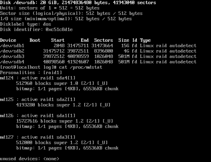 -> cat /proc/mdstat or mdadm --detail /dev/mdXX 명령어를 통해 확인