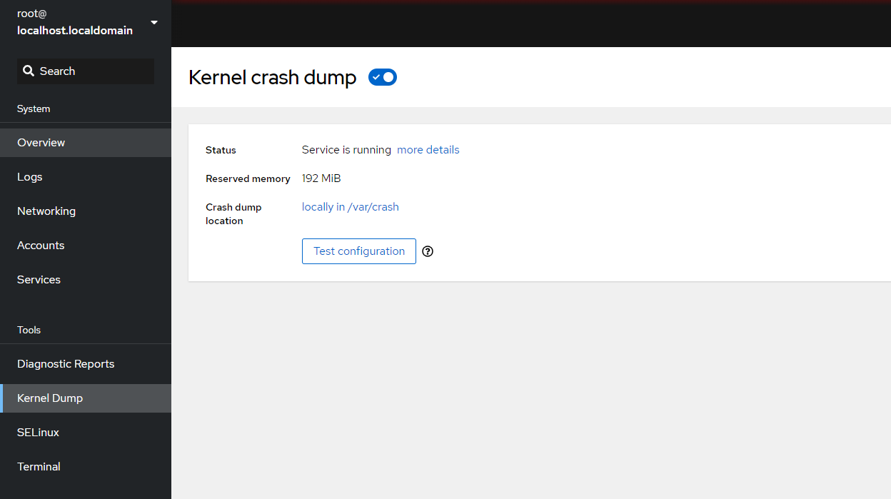 kdump를 끄고 켤 수 있으며 테스트로 크래쉬를 발생시킬 수 있다. 실제로 리부팅되니 주의