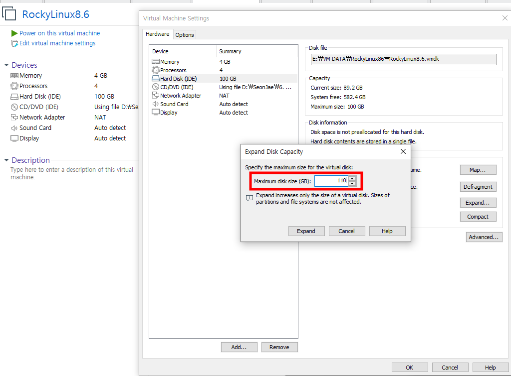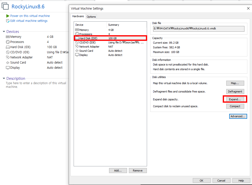 Click : Vmware Machine Settings > Hard Disk > Expand..