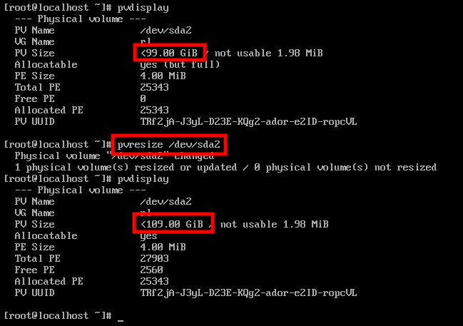 pvdisplay 명령어를 통해 pysical volume size를 확인하고 pvresize /dev/sda2 명령어를 통해 늘어난 사이즈를 인식시킵니다.