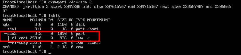 sda에 110G로 변경되었으니 sda2에는 할당되지 않았음을 확인 할 수있습니다.